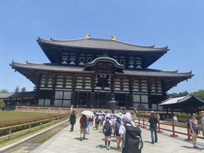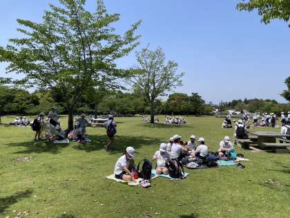 東大寺では、大仏を見ました。大仏の大きな手や体は、とても迫力がありました。春日野園地では、お昼ごはんを食べたり遊んだりしました。
