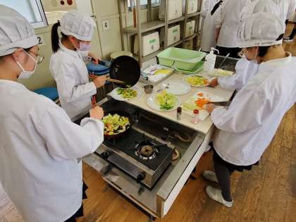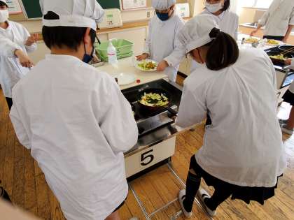食材の切り方や炒める順番を意識しながら取り組みました。班で協力・分担しながら活動することができました。