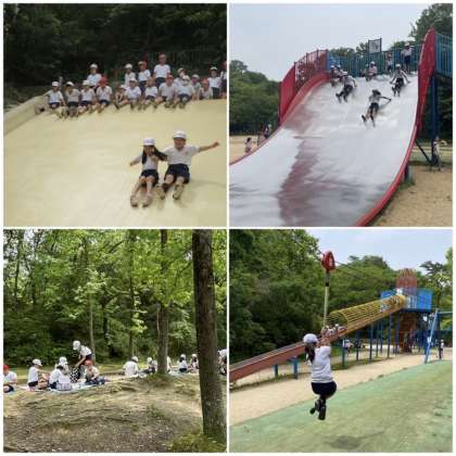 昼食の後は、やんちゃの里に広がる大きな遊具で、自由遊びです。子どもたちは、たくさんの種類の遊具で、思う存分楽しんでいました!