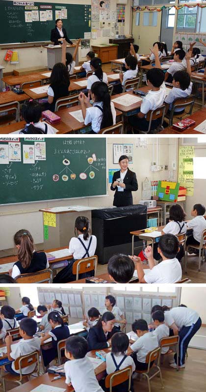 14日(月)から常盤小学校で学んでいる2名の教育実習生が、食育についての授業をしました。3時間目にM先生(2年1組)、5時間目にK先生(2年5組)です。