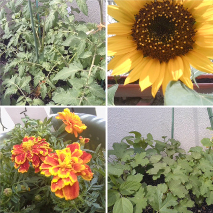 毎日、交代で水やりをしています。順調に生長していて、マリーゴールドやヒマワリ、コスモスは、きれいな花を咲かせています。野菜たちは、収穫できる日が来るのが待ち遠しいです。