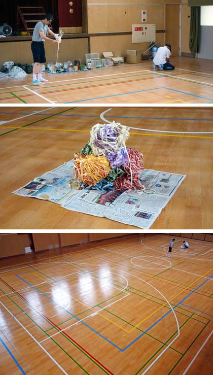 ラインの色が乾いたら、マスキングテープをはがします。ちなみにマスキングテープは、色がはみ出ないように、塗りたい場所の周囲を覆うように貼るテープです。2枚目の写真が、はがした後のマスキングテープのかたまりです。はみでた色がついていますね。