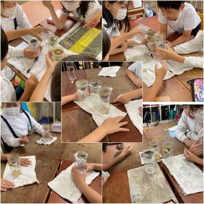 実験前に「種類ごとに水のしみこみ方は違うかな?同じかな?」と予想を立てて行いましたが、実際に実験を行った際には「全然早さが違う!」「すぐ出てきた!」「全然出てこない!」と、土の種類ごとの全く違った結果に驚いた様子が伺えました。