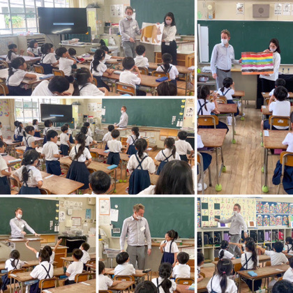 ネイティブスピーカーの先生をお招きして、1年生の各クラス1時間ずつ英語レッスンを受けました。これは、阿倍野区のグローバル人材育成支援事業の一環で行われたものです。