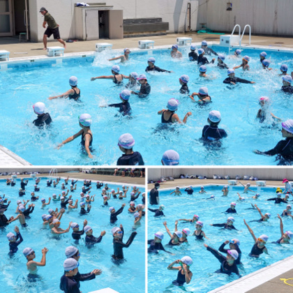 学習の流れと約束を確認した後、プールに入って1年生の時にやったことのある「アヒルの体操」をしました。短い時間でしたが、元気いっぱいプールの中で体を動かしていました。