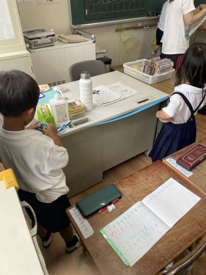 「テープを使って長さを比べる」ことをめあてに、自分たちのテープを使って、教室にあるたくさんの物を夢中になって測りました。テレビや机、黒板など、普段長さを測ることのないような物を、ペアで一生懸命測る姿は、とても素晴らしかったです。