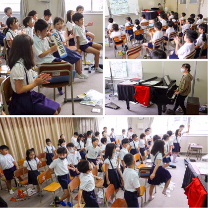 「♪ドレミで歌おう」の歌。大きな声で、小さな声で、階名で、手拍子をつけて、鍵盤ハーモニカを演奏しながら、その場で足踏みをしながら、などなど。いろいろな歌い方で楽しく歌うことができました。