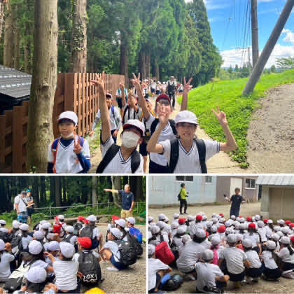 2,3,5組は魚つかみ会場に、1,4,6組は焼き板工作会場に到着!