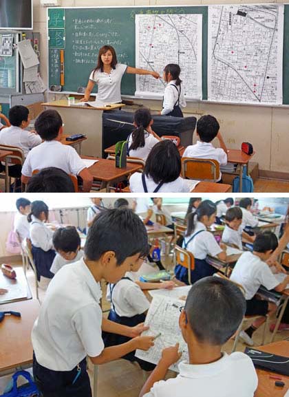 5年生の各学級で、「交通事故を防ごう」というテーマの学習を行っています。授業で使うワークシートには校区地図が印刷されていて、児童・保護者のみなさんに、校区内で危険だと思う所や怖い思いした場所、どのように危険なのか等を事前に書き込んでもらっています。