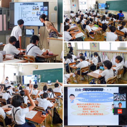 大型テレビに講師の方とスライド映像が映し出されていました。子どもたちは、講師の方のお話を聞いたり、それに反応したりしながら、気づいたことや考えたことをワークシートに書き込んでいきます。考えを交流するグループワークの時間もありました。