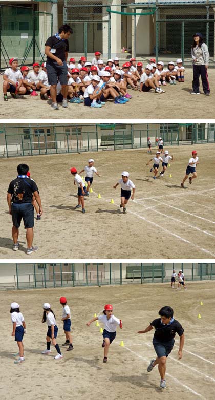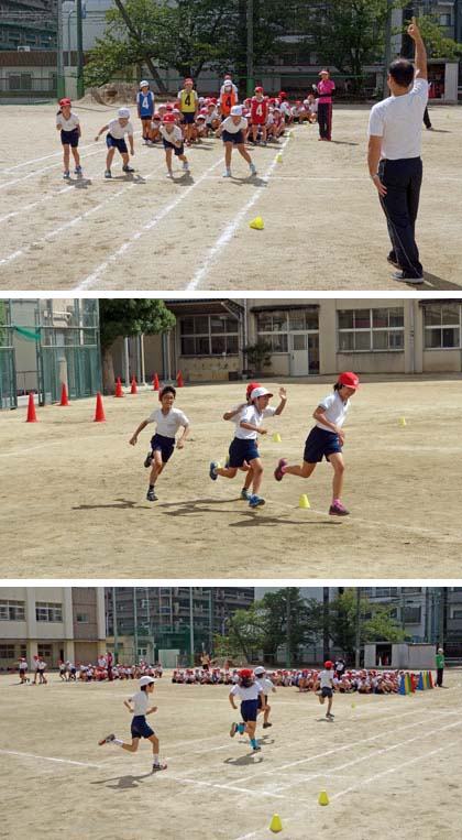 3時間目、運動場で走競技の練習。個人走に出る子と、リレーに出る子に分かれて練習していました。