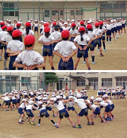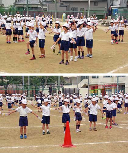 団体演技の練習です。まずは1年生。ペットボトルの扱い方、ずいぶん上手になりました!