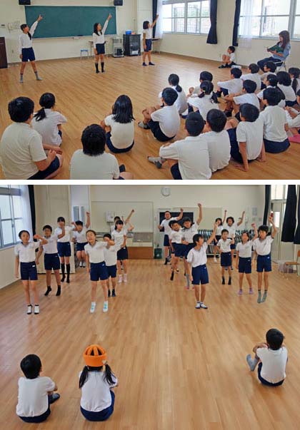 5年生の練習。3組と2組は、多目的室で細かい部分の確認と「Goin'on」のテスト。みんなの前で堂々と踊っていました。2組では「Goin'on」の歌詞を覚えている子が何人もいて、口ずさみながら見たり踊ったりしていました。