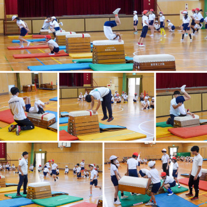 この時間は、台上前転に取り組んでいました。回り方を教えてもらったり、補助してもらったりしました。「できた!」「次は5段!」子どもたちは、コツやポイントを理解して、積極的に取り組んでいました。