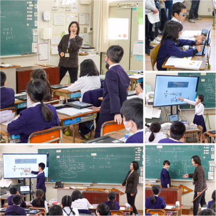 「仮分数を帯分数にすれば…」「帯分数を仮分数にすれば…」「どちらかにそろえたらいい!」自分の考えをノートに書いて、タブレットで撮影し、送信。これで、みんなの意見をタブレットやモニターで確認することができます。