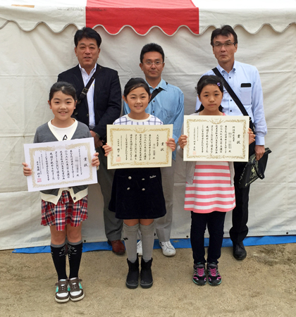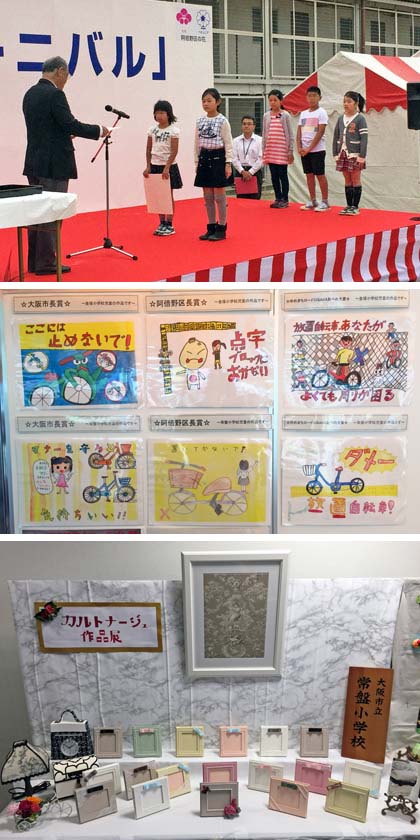 オープニングセレモニーの後、ステージでは、「ゆめまちロードOSAKAあべの」主催、放置自転車禁止・ポイ捨て禁止ポスターの入選作品の表彰がありました。常盤小学校からは5年生児童が応募したのですが、3人の児童が見事入選! 「大阪市長賞」「阿倍野区長賞」「ゆめまちロードOSAKAあべの大賞」を受賞し、表彰されました。おめでとう!