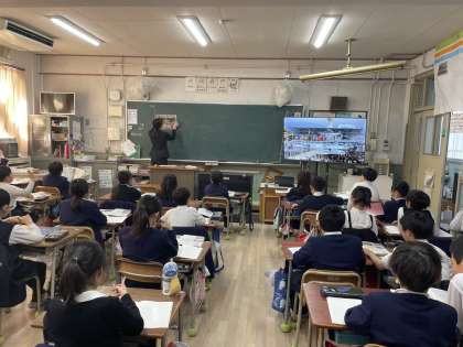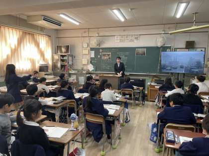その後、当時の大阪市の様子について、主に交通手段の発達を中心に考えていきました。当時開通していた6つの地下鉄路線全て理解している子も大勢いて、これまでの学習にしっかりと取り組んでいたことが分かりました。発展してきた歴史だけでなく、排気ガスで引き起こされる公害についても学習する場面があり、みんな神妙な顔で聞いていました。