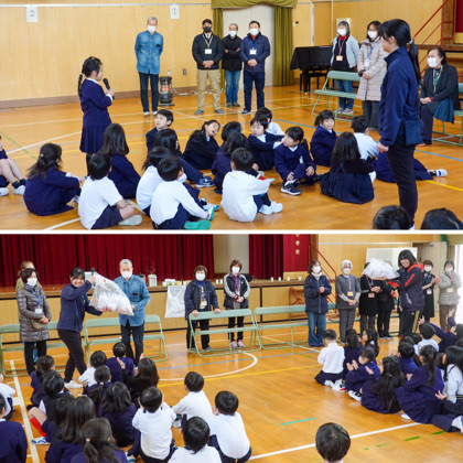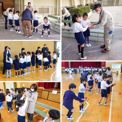 2〜4時間目、地域の皆様に伝承遊びを教えていただきました。2学級ずつ各1時間の3部構成。遊びは、コマ回し・あやとり・けん玉の3種類です。