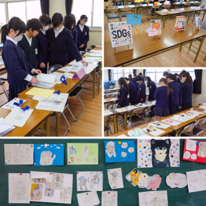 写真は、6年生が見学しているところです。感心したり驚いたりしながら、作品を見て回っていました。