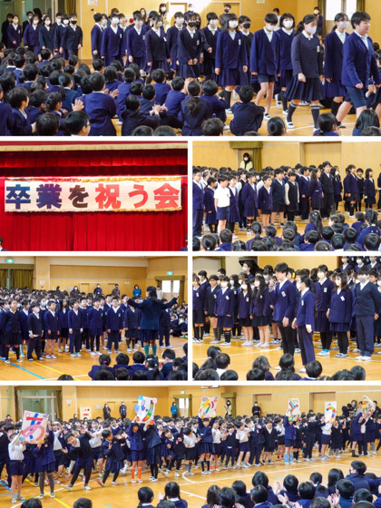 2,3時間目、「卒業を祝う会」が行われました。今年は、第1部(1,2,4年生と6年生)と第2部(3,5年生と6年生)という2部制で実施しました。