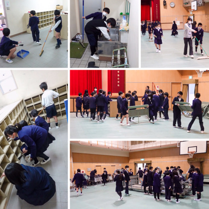 2,3時間目、5年生が講堂フロアのシート敷きといすならべ、清掃をしました。卒業式の式場設営です。