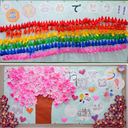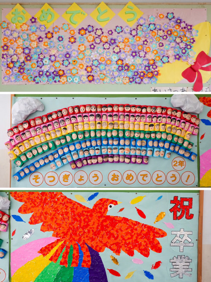 卒業お祝い掲示です。各学年で1枚ずつ、子どもたちによる共同制作です。6年生が通る階段やろうか、ロビーに掲示されていました。