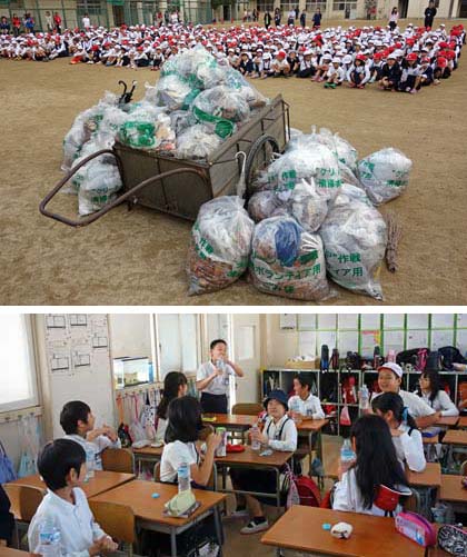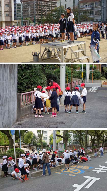この清掃活動は、10月25日(日)に行われた大阪マラソンに向けた「クリーンアップ作戦」の一環として実施したので、南部環境事業センターの方が専用のごみ袋を持ってきてくださっていました。子どもたちは熱心に取り組み、そのごみ袋にたくさんのごみを集めることができました。落ち葉が多かったのですが、たばこの吸い殻や空き缶等の不燃物、ライターや傘まで落ちていたそうです。集めたごみは、翌日、特別に収集してもらいました。