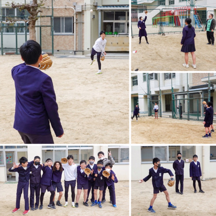 ロサンゼルス・ドジャースの大谷翔平選手寄贈のグローブを使って、キャッチボールをしていたのは、6年生の子どもたちです。