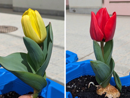 このところの暖かさで、1年生が植えたチューリップが咲き始めました。