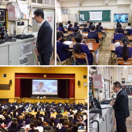 着任式と1学期始業式を、Teamsを活用したオンラインで行いました。2,3年生は講堂で、4〜6年生は新学年の各教室で式に臨みました。(1年生は、その時間も学級活動を行いました)