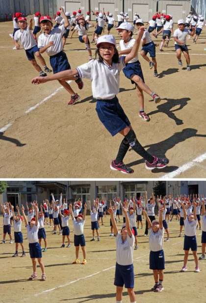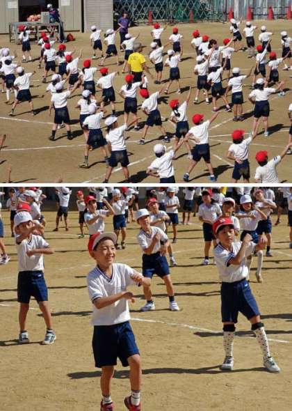 2時間目、運動場で練習。曲に合わせて通して踊っていました。