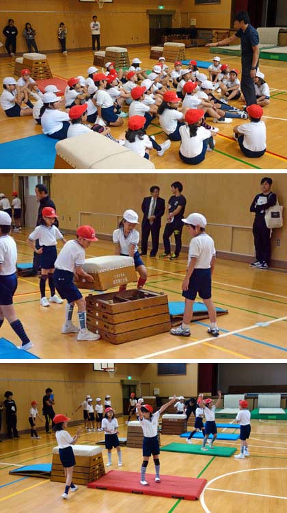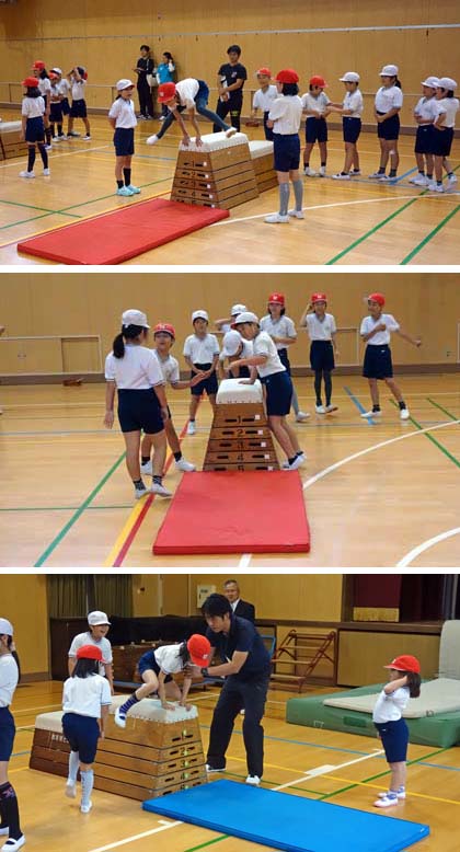 6時間目、講堂で体育の学習。跳び箱運動に取り組んでいました。この授業は、常盤小学校の先生だけではなく、大阪市内のいろいろな学校の先生方(体育科を研究している先生)が見に来ていました。