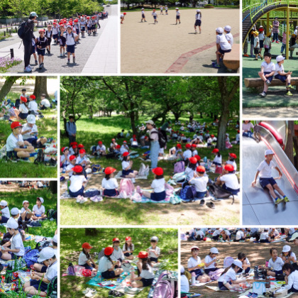 あっという間にお昼。クラスごとに広がってお弁当です。外で、みんなで食べるお弁当は、やっぱり最高!