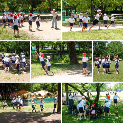 JR久宝寺駅で電車を降り、30分ほど歩いて目的地に到着です。現地に着いたら、3クラスずつに分かれて、「もくもく元気広場」と「芝生広場」で遊びました。もくもく元気広場は、遊具が充実。芝生広場では鬼ごっこをしたり、長なわをしたり、虫探しをしたり。“だるまさんがころんだ”も大流行!