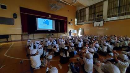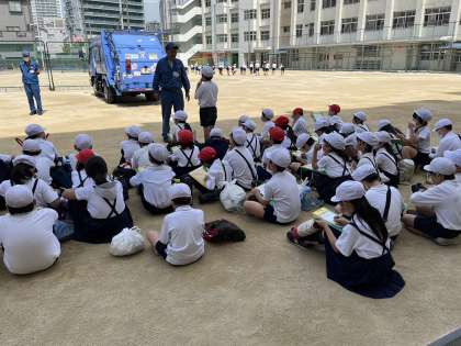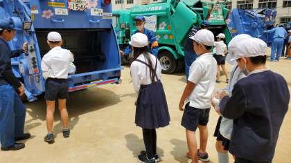 5月23日は環境事業センターの職員さんにお越しいただき、ごみの処理や分別、3R(リデュース、リユース、リサイクル)やパッカー車についての出前授業を行っていただきました。
