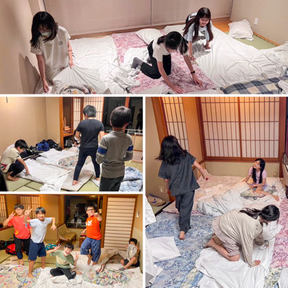 夕食後、しばし部屋でゆったりと過ごしているうちに、まもなく就寝時刻。部屋の片づけをして、布団を敷きました。