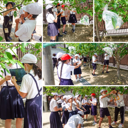 6年5組の子どもたちが、運動場の桜の木のところで実験中。