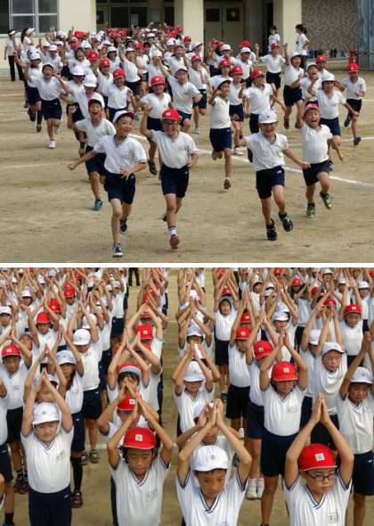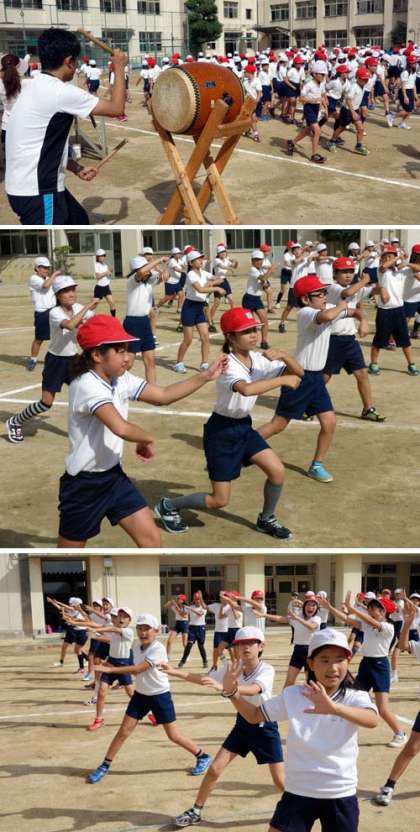 5時間目、運動場でダンス『疾風』の練習。雨上がりの空の下、水たまりに土を入れて、グランドコンディションを少しでも良くしようと作業をする5年生の先生方。