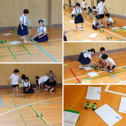 3時間目、理科の学習。講堂で車を走らせる実験をしていたのは、3年4組の子どもたちです。