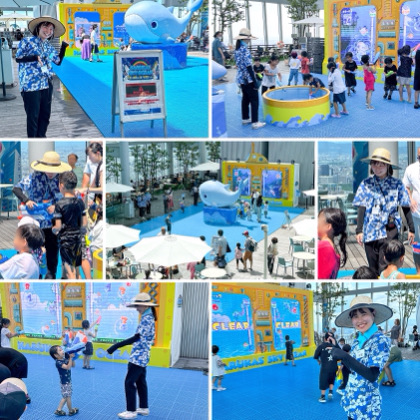 社会体験研修は、視野を広げ、対人関係能力や教員資質の向上等を目的に行うものです。先生方が担当したのは、ハルカス300(展望台)58階の天空庭園で開催されている期間限定イベント「ハルカス スカイオーシャン〜天空に出現した海で水遊びしよう!〜」のスタッフの仕事です。