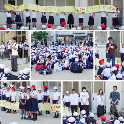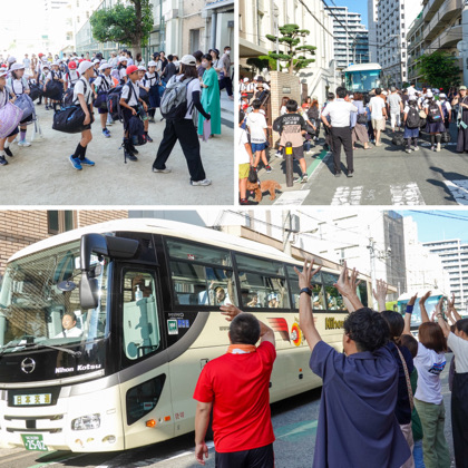 1泊2日の林間学習、いよいよスタートです! 運動場で出発式を行い、バス6台で予定どおり出発しました。保護者の皆様、お見送り、ありがとうございました。
