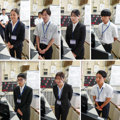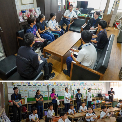 7名の大学生は、児童朝会(オンライン)で自己紹介とあいさつを行いました。所属学級は1年4組、2年1組、2年4組、3年4組、4年2組、5年3組、6年6組です。