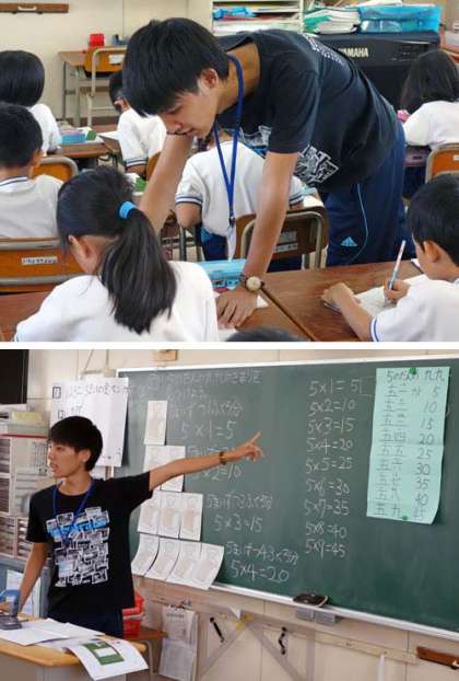 1時間目、算数の学習。実習生のO先生が前に立って授業をしていました。