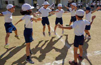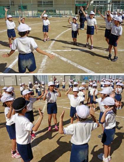 2時間目、運動場でダンスの練習。ここのところ、「見本をします!」「まねをします!」のパートの練習が中心です。