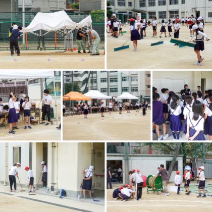 整地作業、用具の確認、ろうかやトイレの清掃、放送機器のチェックとアナウンス練習などなど、準備は多岐にわたりました。その間、応援団員は、最終の練習を行いました。児童が下校した後も、教職員で作業を続けました。