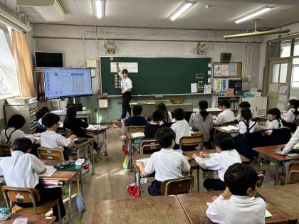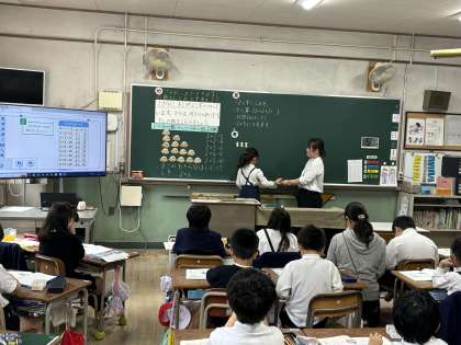 1日(金)3時間目に2年5組でU先生による算数科の公開授業がありました。授業では、単元「かけ算」を学習しました。一皿に2つずつ入っているおすしの数を求める問題でしたが、増えていくお皿の数にあわせて、かけ算の式を作り一生懸命取り組んでいました。最後までみんな集中が切れることなく、素晴らしい授業態度でした。
