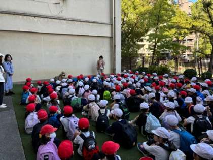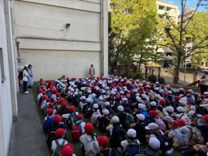 7日(木)は2年生がキッズプラザに遠足の日でした。朝から少し寒さを感じる気候でしたが、みんな元気に登校していました。写真は学校を出発する時の様子です。