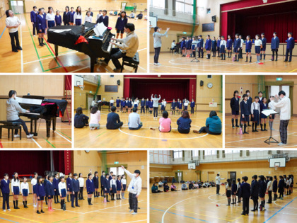 指揮は5,6年生音楽専科のM先生、ピアノ伴奏は3,4年生音楽専科のM先生です。