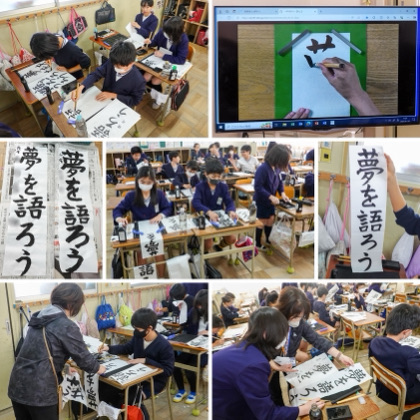 いつものより長い半紙に「夢を語ろう」と書きます。M先生の説明と指導に加えて、動画資料を見て最終確認。いざ書き始めです。