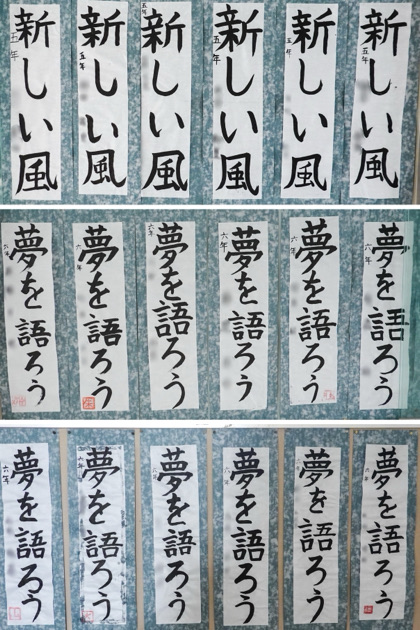常盤小学校の本校には、ロビーと階段の踊り場に、児童の作品掲示板があります。今月は、4〜6年生の書き初めが掲示されています。